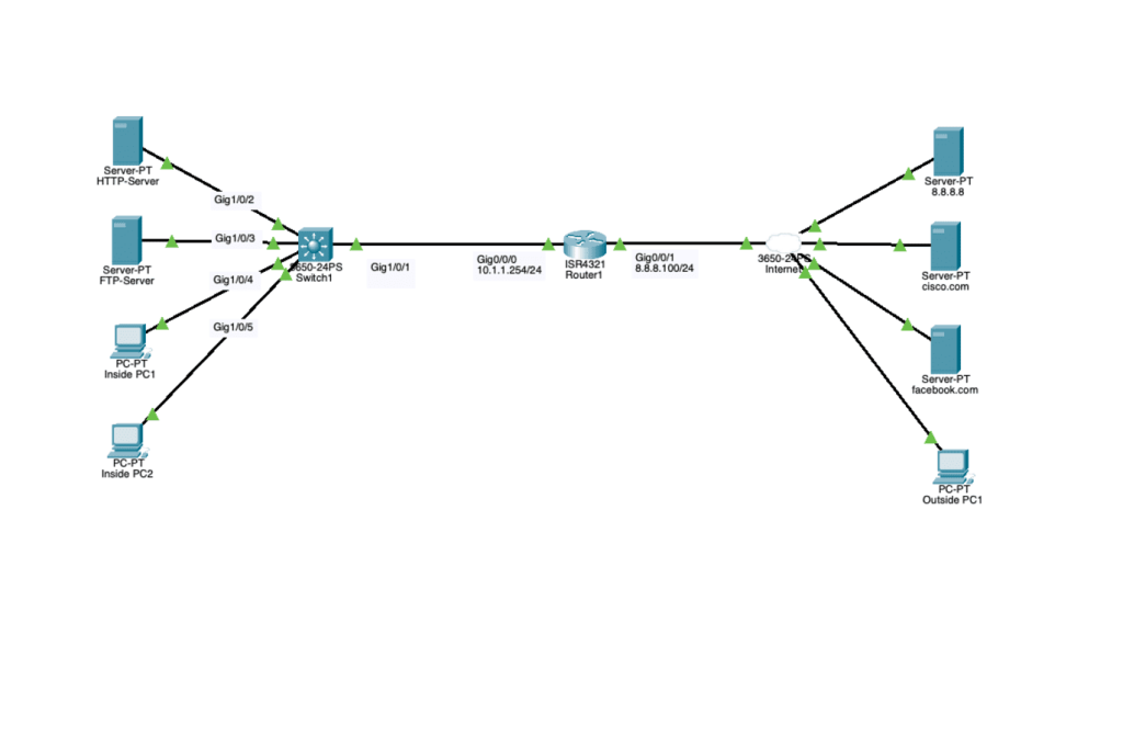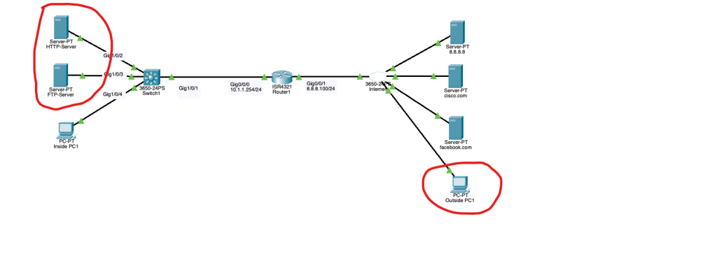 For the Lab above, a static NAT is configured for the Servers so the outside PC can access them through HTTP, HTTPS, or FTP.  The IP address for Server HTTP and FTP is ‘natted’ to the Router1